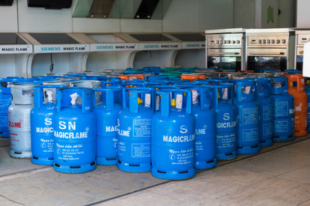 Hanoi, Vietnam - Apr 28, 2015: Gas bottles for sale in a store in Xuan Thuy street