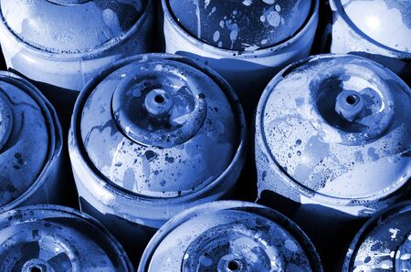 A lot of used spray cans of paint close-up. Dirty and smeared cans for drawing graffiti. The concept of a sweeping and careless drawing of paint. phantom classic blue color.