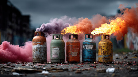A striking image of gas canisters emitting colorful smoke and flames, set against a gritty urban backdrop, showcasing energy and artistry in a dramatic way.