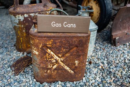 Antique used gas cans. A vintage scene. A rustic Jerry can in the museum, Kootenays, British Columbia, Canada. Close-up view
