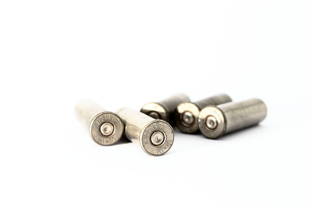 Scattered bullets on a white background. Concept of ammunition, firearm safety, military gear, crime investigation.