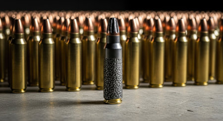 A single distinctive black rifle cartridge with a textured surface stands prominently in front of a blurred row of numerous golden ammunition rounds.