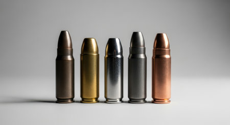 Five distinct metallic rifle bullets, including gold, silver, and copper, standing upright in a row on a clean surface. Represents power, defense, and conflict.