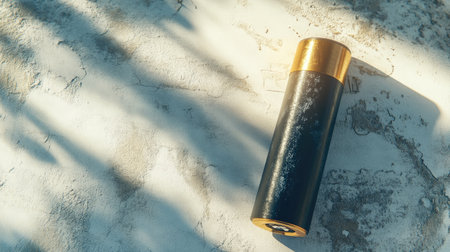Elegant black and gold thermos positioned on a textured surface, casting intriguing shadows. Ideal for showcasing modern drinkware design and stylish lifestyle elements.