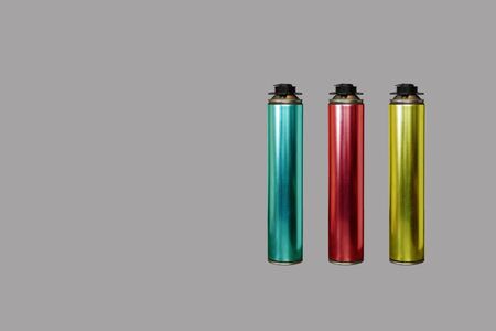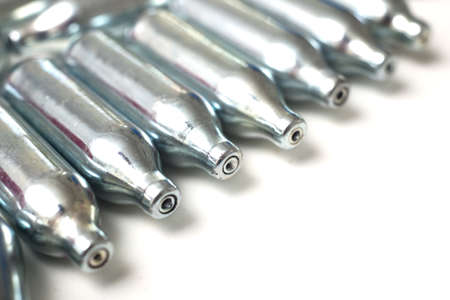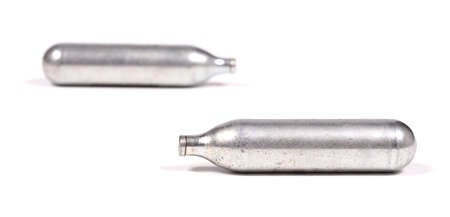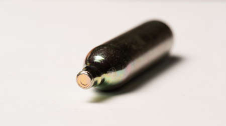 Closeup of hilarious gas n2o in metallic siphon cartridge in hand on white background