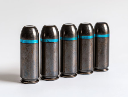 Close-up view of rifle ammunition cartridges standing upright in a straight row. Military supplies, weapon ammunition and combat equipment concept. Clean composition with shallow depth of field and blurred background.