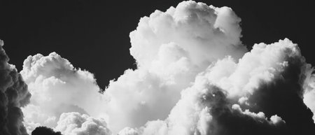 Dramatic black and white cloudscape featuring towering thunderclouds forming against a dark sky, creating a powerful and moody atmosphere