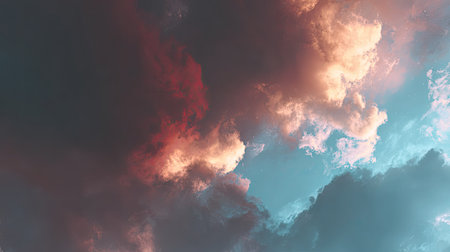 Vibrant clouds illuminated by the setting sun create a stunning display of colors in the evening sky. Soft hues of orange and pink blend into blue offering a peaceful view.