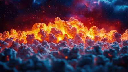 A fiery explosion with thick smoke clouds in a surreal space environment, evoking intensity and a cosmic, otherworldly feel.