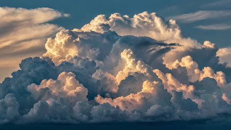 Ornamental clouds. Dramatic sky. Epic storm cloudscape. Soft sunlight. Panoramic image, texture, background, graphic resources, design, copy space. Meteorology, heaven, hope, peace concept
