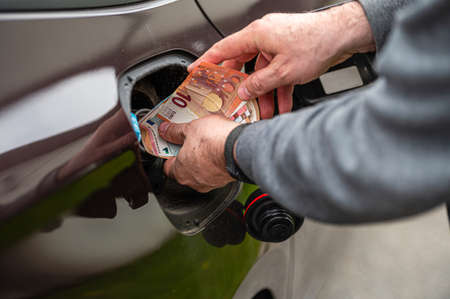 hand of man that puts money into the tank of car, close-up, concept of expensive fuel, fuel crisis