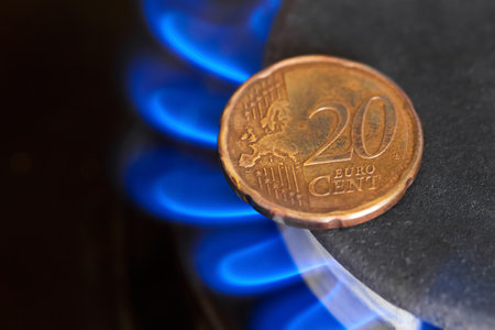 Close-up of 20 cent coin on gas stove burner with flame, as natural gas price increase concept