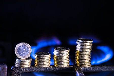 Gas stove lit, with stacks of coins above it. Increase in gas costs and tariffs.