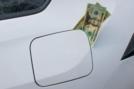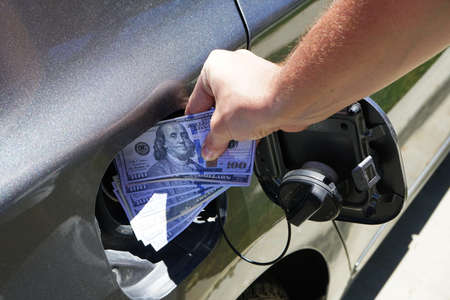 Money sticking out of automobile fuel tank opening signifying and illustrating the high cost of gas