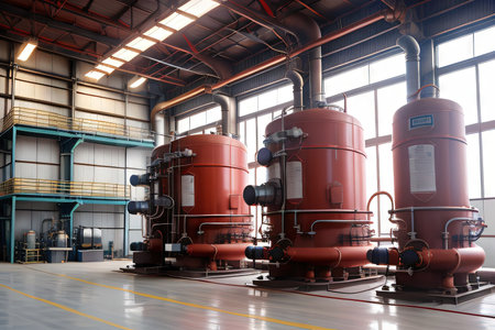 Drinking water factory production, industrial interior. Large metal tanks for filtering and potable water treatment from well.