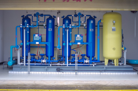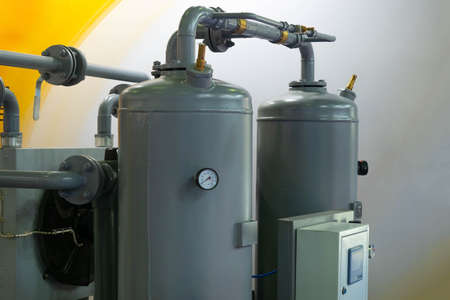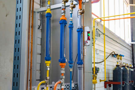 Gas industry, oxygen cylinders and pipes with valves, Air filter in the gas industry.