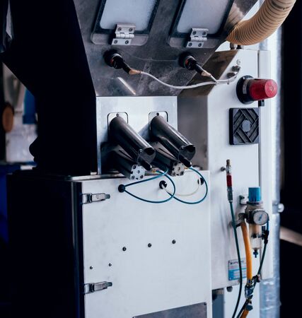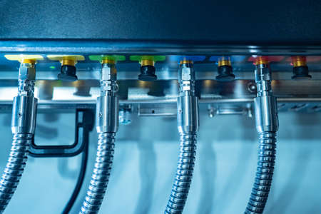 Close-up numerous metal plugs hang next to instrument panels at a factory for the production of specialized equipment. Industrial Manufacturing Concept