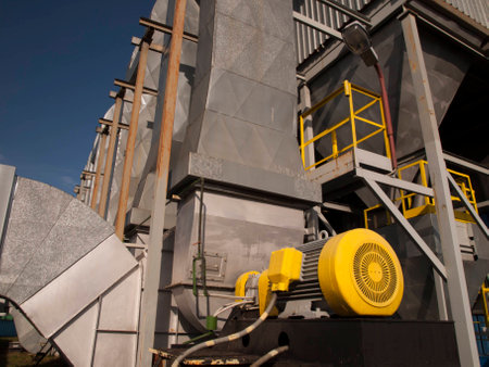 Close-up view of industrial filter components showcasing vibrant yellow and blue colors in a modern facility, emphasizing advanced technology and machinery design.