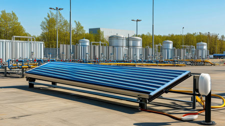 This image features a solar water heating system situated within an industrial environment. It showcases a blue solar panel alongside silvery storage tanks under a bright sky, highlighting sustainable energy solutions.