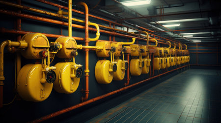 Wide-angle view of an underground natural gas storage facility with pipes, valves, and monitoring equipment, AI Generated