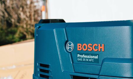 Strasbourg, France - Feb 9, 2020: Red Bosch Logotype on the Professional GAS 35 M AFC Wet and Dry Vacuum Cleaner, 35 L with automatic filter cleaning dust class M