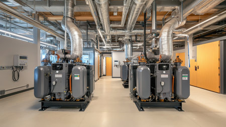 A modern mechanical room showcasing industrial equipment and advanced systems. The image features pipes, heating and cooling machinery, emphasizing efficiency and technology in industrial design.