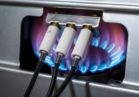 This close-up image showcases the vibrant blue and yellow flames of a gas stove in a kitchen, emphasizing the energy and efficiency of cooking at home.