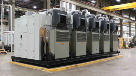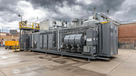 A large industrial power generator system is displayed against a backdrop of a dramatic cloudy sky, showcasing modern technology and machinery in an urban commercial setting.