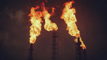 This striking image captures flames erupting from industrial gas flares at a refinery, set against a dramatic dark sky, showcasing energy production.