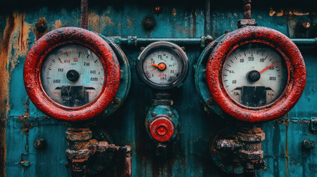 Close-up of vintage industrial gauges featuring rusty red frames against a weathered blue metal background, perfect for themes related to machinery and engineering.