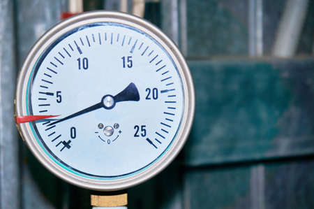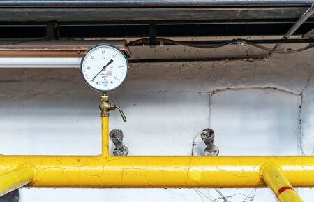 Industrial pressure gauge on pipes in the workshop of an oil and gas processing plant, pressure gauge in boiler room.