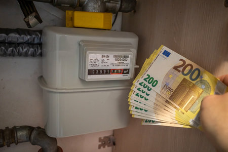 next to the gas meter is held a lot of two hundred euro banknotes
