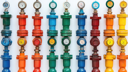 A vibrant arrangement of industrial pressure gauges and valves in various colors set against a clean white background. Ideal for engineering and safety themes.