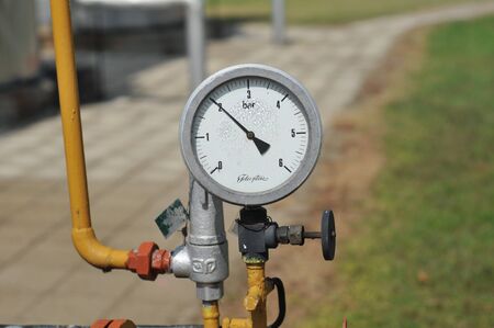 The pressure gauge indicates the pressure in the pipeline. Close-up.