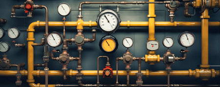 A close up of a bunch of valves and gauges on the wall, AI