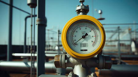 Industrial pressure gauge measuring gas pressure on pipelines, ensuring safe and efficient operations within a complex network of energy distribution and resource management