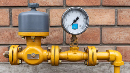 Industrial gas pipe with regulator and pressure gauge against a brick wall