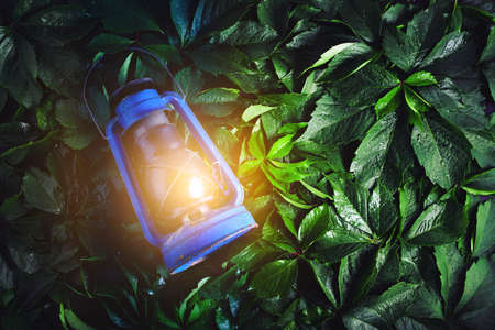 Burning kerosene lamp lying on lush and wet green foliage after rain