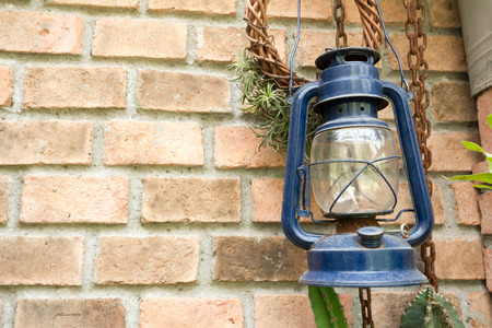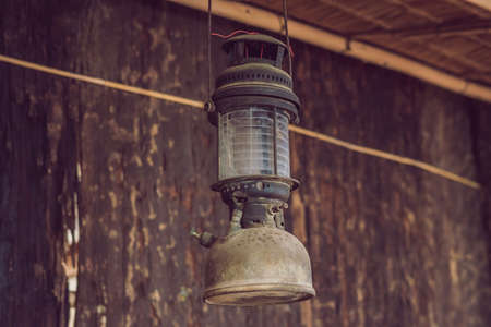 antique oil lamp hanging on a tree in the forest in the evening camping atmosphere.Travel Outdoor Concept image.soft focus.