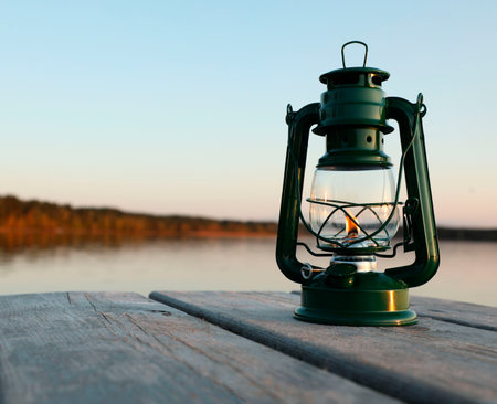 Old classic oil lantern burning with an orange flame by the ocean at dusk. . High quality photo