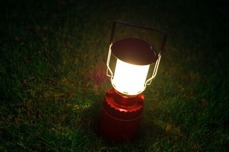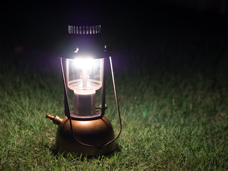 Antique oil lamp Light on the lawn at night, Old camping lights, Ancient lantern.soft focus.Vintage Styled.