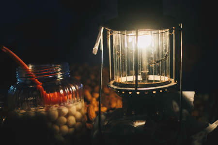 Oil Lamp Lighting up the Darkness or Burning kerosene lamp background, concept lighting