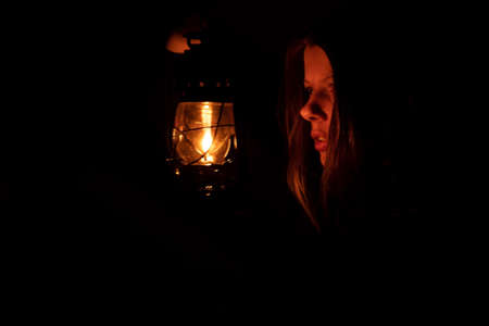 Young Ukrainian girl with a kerosene lamp in the dark sits at home without light