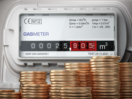 Growth of natural gas price. Savings of energy and energy efficiency concept. Gas meter with stacks of coins. 3d illustration.