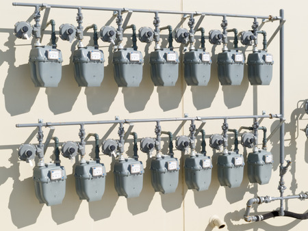 Row of gas meters feeding businesses outside.