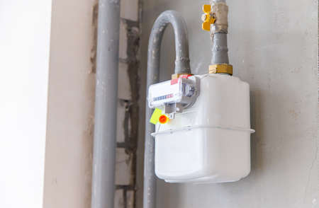 gas meter on the wall in the house. Selective focus. white.