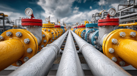 Colorful valves and gauges on industrial pipelines, highlighting energy infrastructure in an outdoor setting, with dramatic clouds enhancing the scene's atmosphere