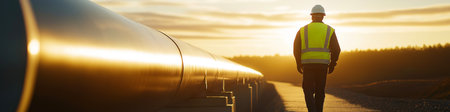 Oil and gas infrastructure. Infrastructure worker walking along a pipeline at sunset