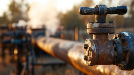 A close-up view of a rusty valve on an industrial pipeline at sunset. The warm light creates an atmospheric scene reflecting on machinery and nature.