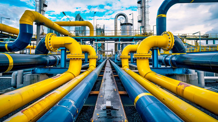 A vivid view of a complex industrial pipeline network showcasing yellow and blue pipes in a manufacturing plant, representing modern energy transportation systems.